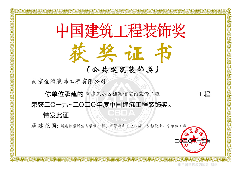 新建溧水區檔案館室內裝修工程榮獲2019-2020年度“中國建筑工程裝飾獎”