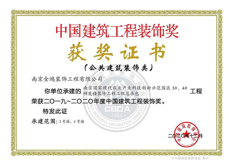 南京國家現代農業產業科技創新示范園區3#、4#研發樓裝修工程工程總承包榮獲2019-2020年度“中國建筑工程裝飾獎”