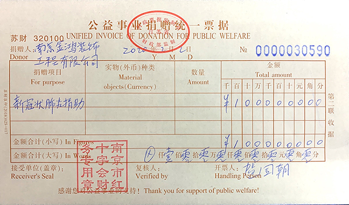 連日來,以湖北武漢為中心的新型冠狀病毒肺炎感染疫情在全國多地爆發(fā)。2月2日,中國建筑裝飾協(xié)會副會長、南京金鴻裝飾工程有限公司董事長徐榮先生代表金鴻裝飾向南京市紅十字會捐贈人民幣100萬元,此捐贈款項將作為疫情防控專款使用。